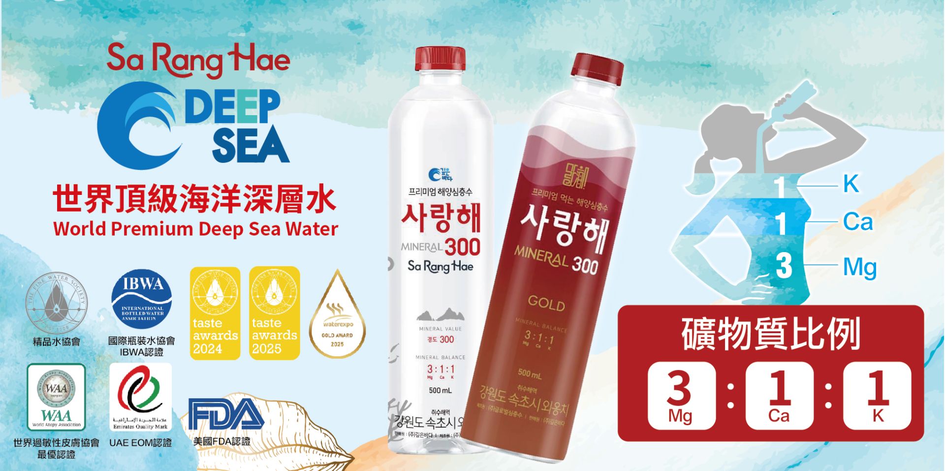 海洋深層水蘊含的天然礦物質,其鎂、鈣、鉀比例 (3:1:1) 與人體 近乎一致,飲用後能迅速有效地被身體吸收 SaRangHae 獲得在全世界最具權威性且評價苛刻之國際認證,是全 球認定最優質的海洋深層水之一。